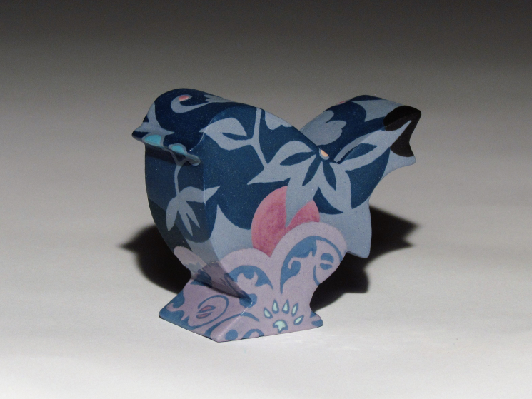 Slab-built, hollow form sculpture in colored porcelain with porcelain slip/resist decoration.