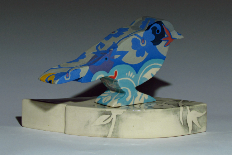 Slab-built, hollow form sculpture in colored porcelain with porcelain slip/resist decoration. Seated on top of a dimensional tile "leaf" base.